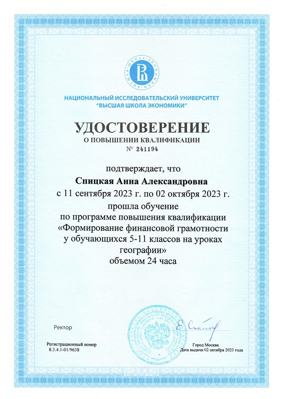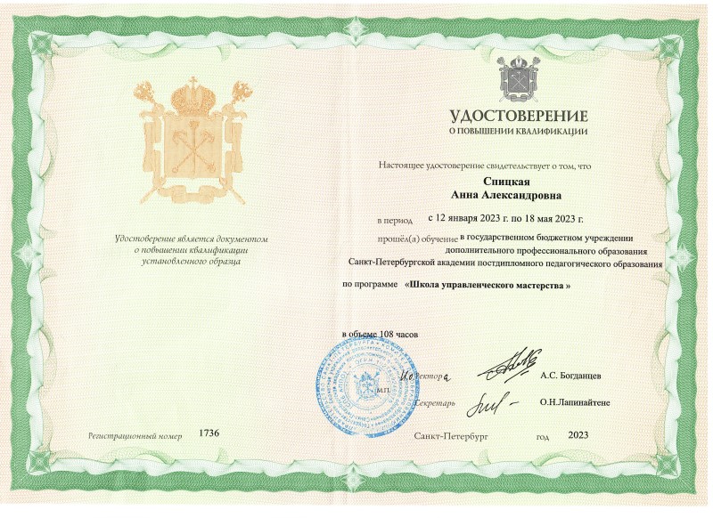 Спицкая Анна Александровна. Удостоверение о повышении квалификации